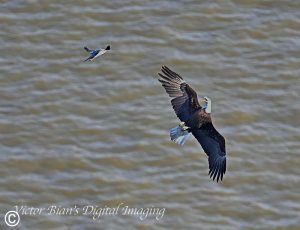 A scene where a peregrine falcon drives off a bald eagle—its territorial instinct is incredibly strong.