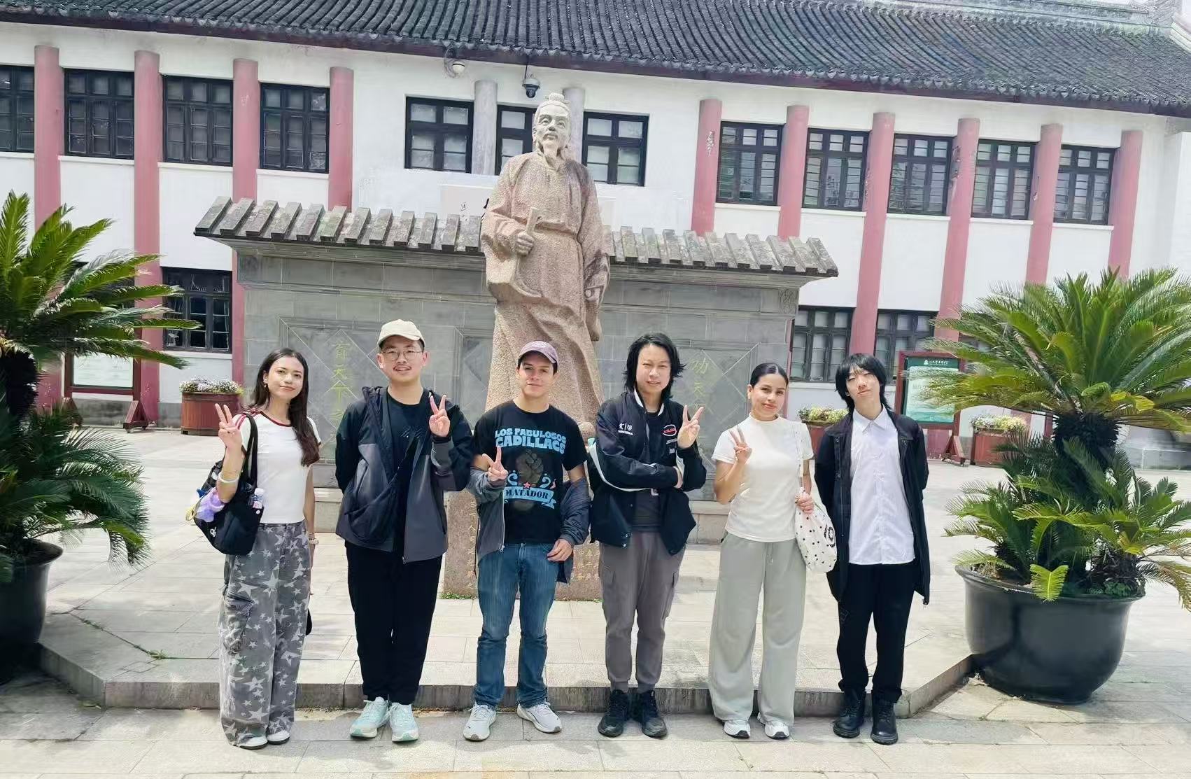We entered through the main gate of the campus, where the iconic statue of Fan Zhongyan stood right before us. During the tour, I didn’t just describe the structure itself; I deliberately focused on its cultural and historical significance in China. I introduced *Notes on Yueyang Tower*, inscribed on the wall behind the statue, and explained the turbulent era of the Northern Song Dynasty when Fan Zhongyan lived, his grand political aspirations, and the profound meaning of the line *“Be the first to concern oneself with the state’s worries, and the last to enjoy its comforts”* in Chinese culture. They were deeply curious about how a school would honor a historical figure with a statue and take his literary spirit as an educational symbol. This sparked a lively discussion between us about the value of learning from the wisdom and virtues of ancient figures in Chinese educational culture.